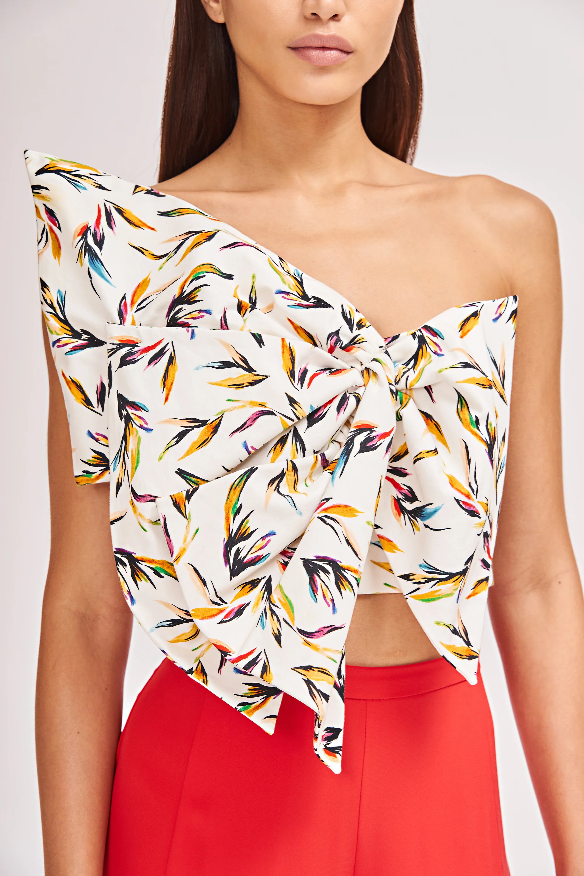 The stunning tropical print on this Noah Top and oversized twisted bow exude destination glam.