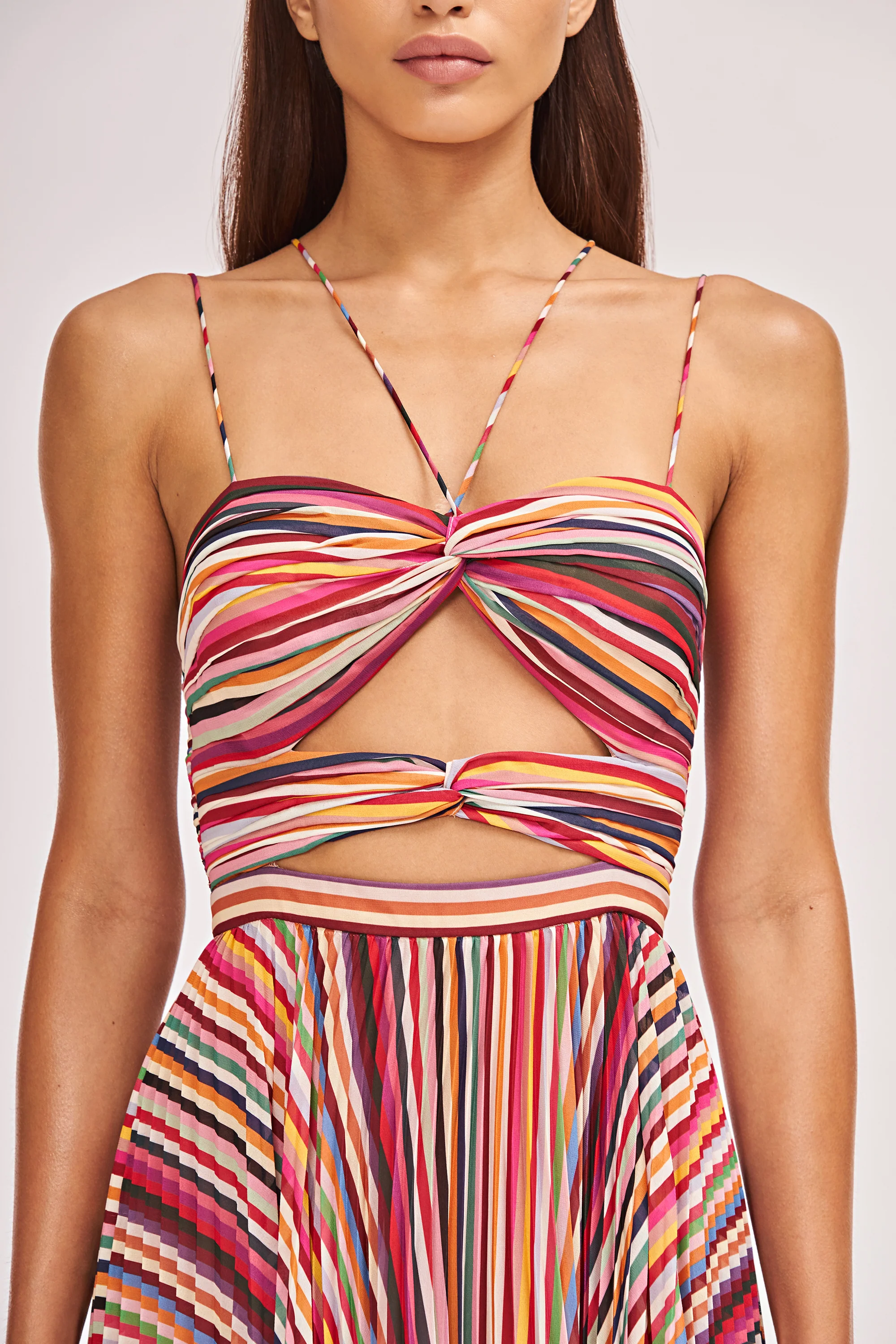 This rainbow pleated Lana Gown has a double twisted bodice and a sleek slide slit.