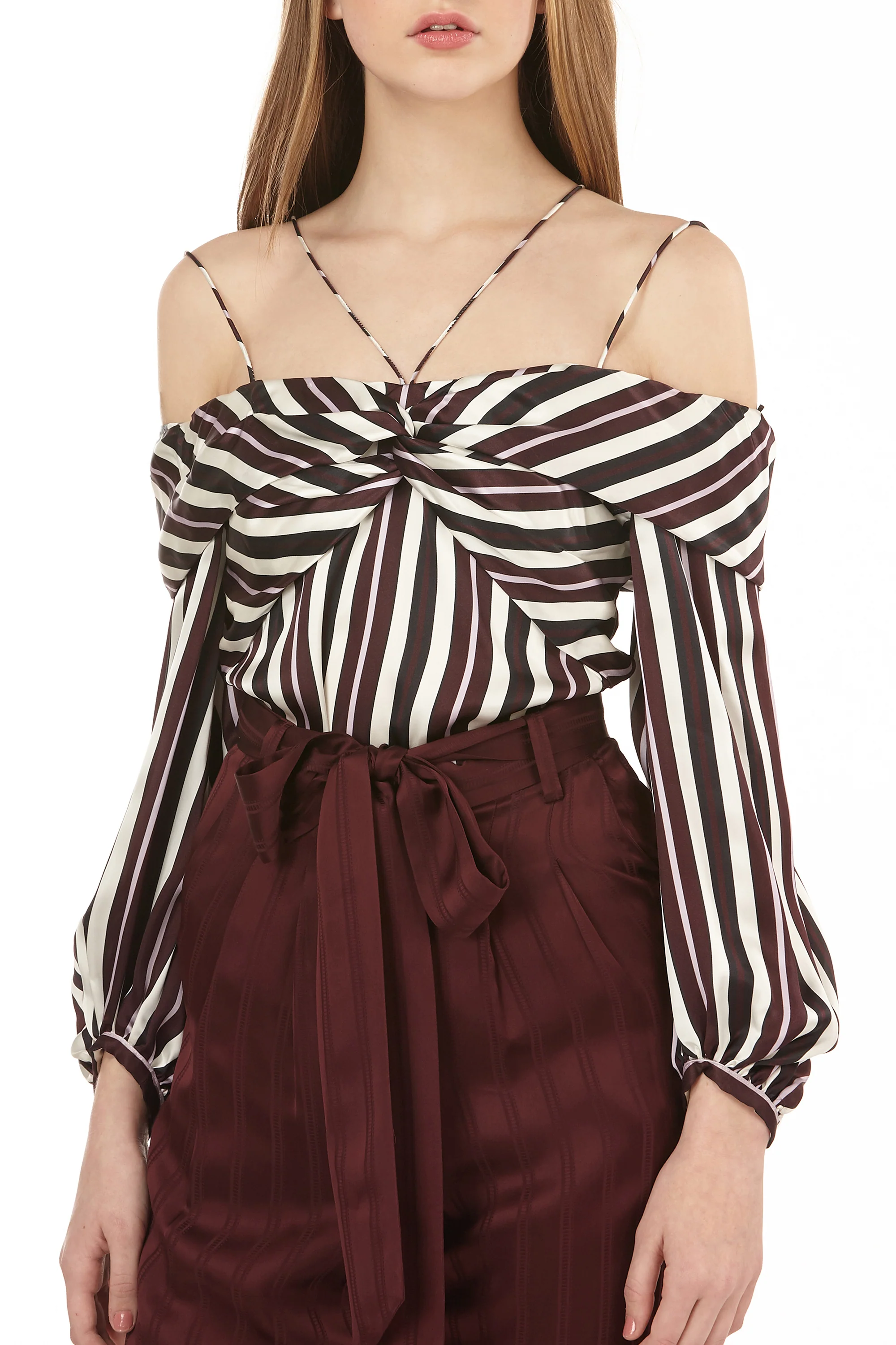 Covered in deco stripe print and featuring a twisted bodice and bishop sleeves, this cold shoulder top can be worn from desk to dinner.