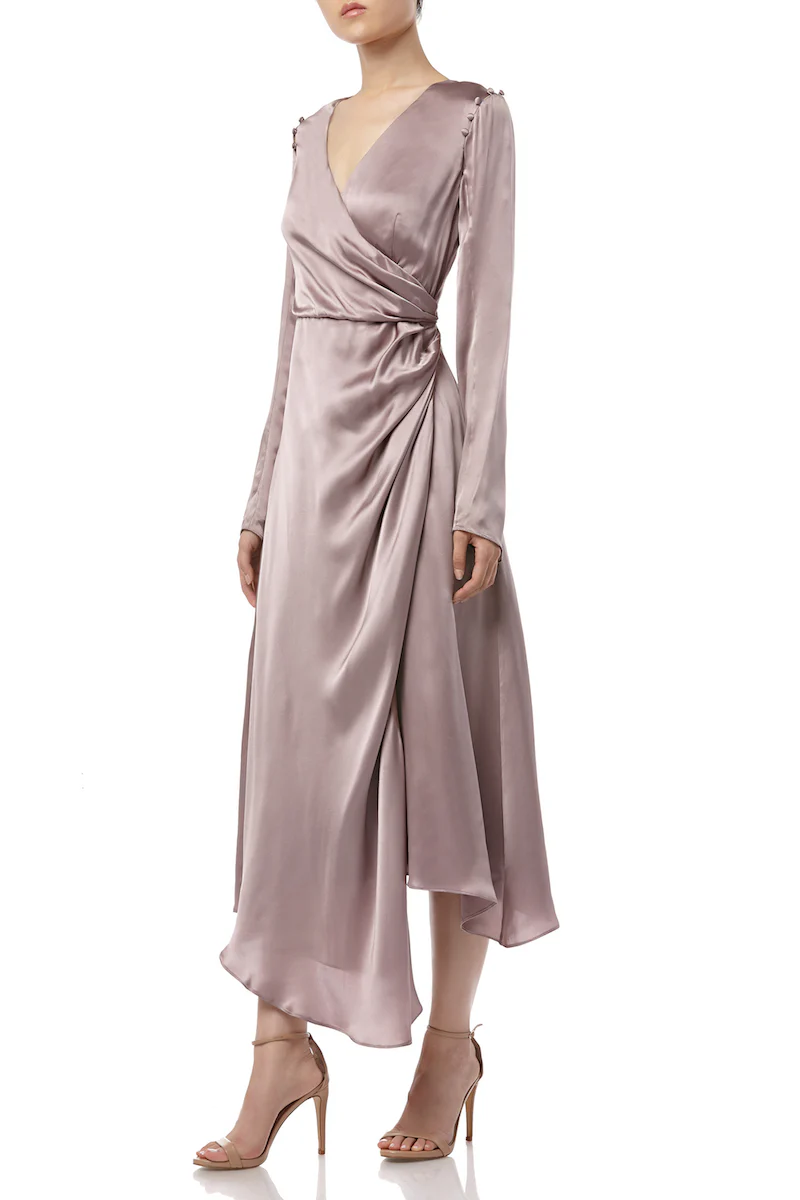 Uniquely structured in silk charmeuse, this Iris Dress features collapsable sleeves, an asymmetric hem and ruched detailing.