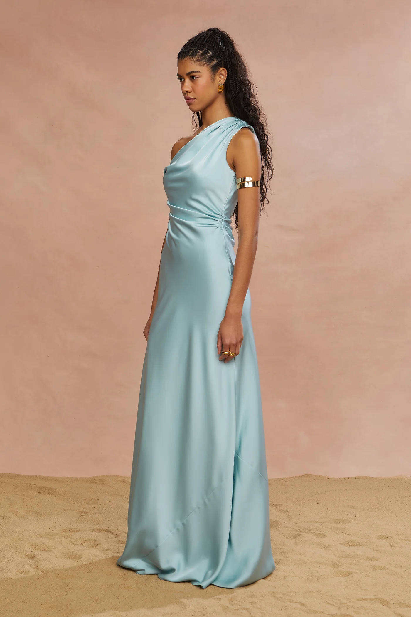 Crafted in heavy charmeuse, this one-shoulder gown contours all the right places. The asymmetric neckline adds a trend-forward twist, while soft draping skims the waist for a universally flattering fit.