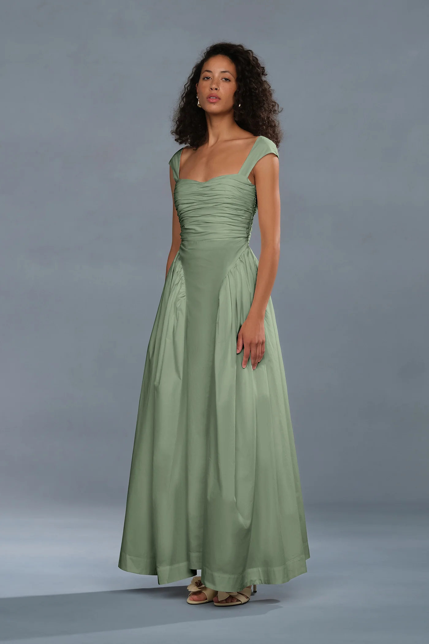 In crisp cotton, this off-shoulder moment keeps things classic with a straight neckline and softly gathered bodice that skims with quiet definition. A faux drop waist drifts into fluid volume, giving the skirt that easy, airy bloom. Casual meets classy—she flips from daytime plans to candlelit dinners without trying.