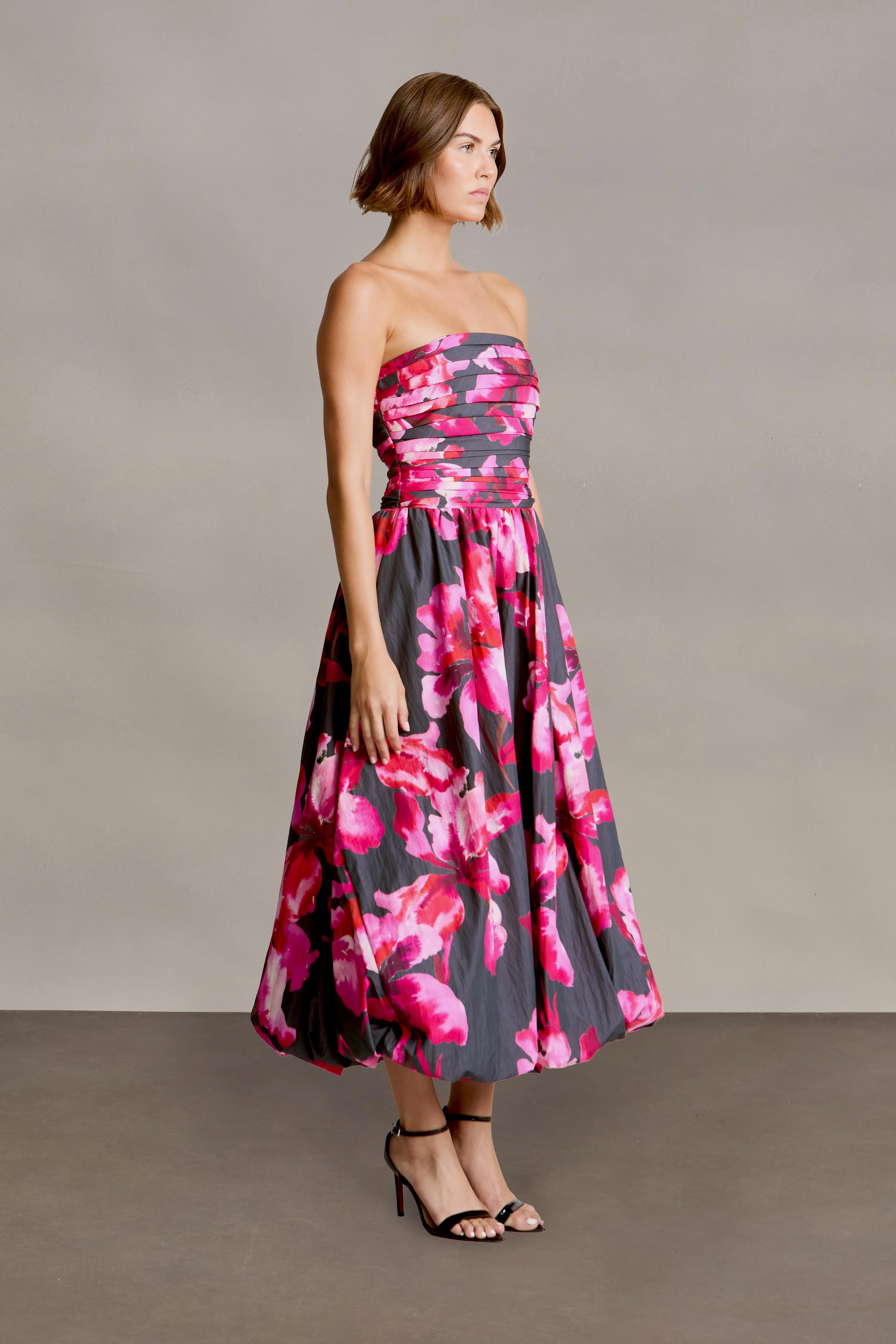 Cut in vibrant wax cotton, this strapless midi flaunts a ruched bodice, semi-drop waist, and soft bubble hem. Garden party? Sunset cocktails? She’s game.