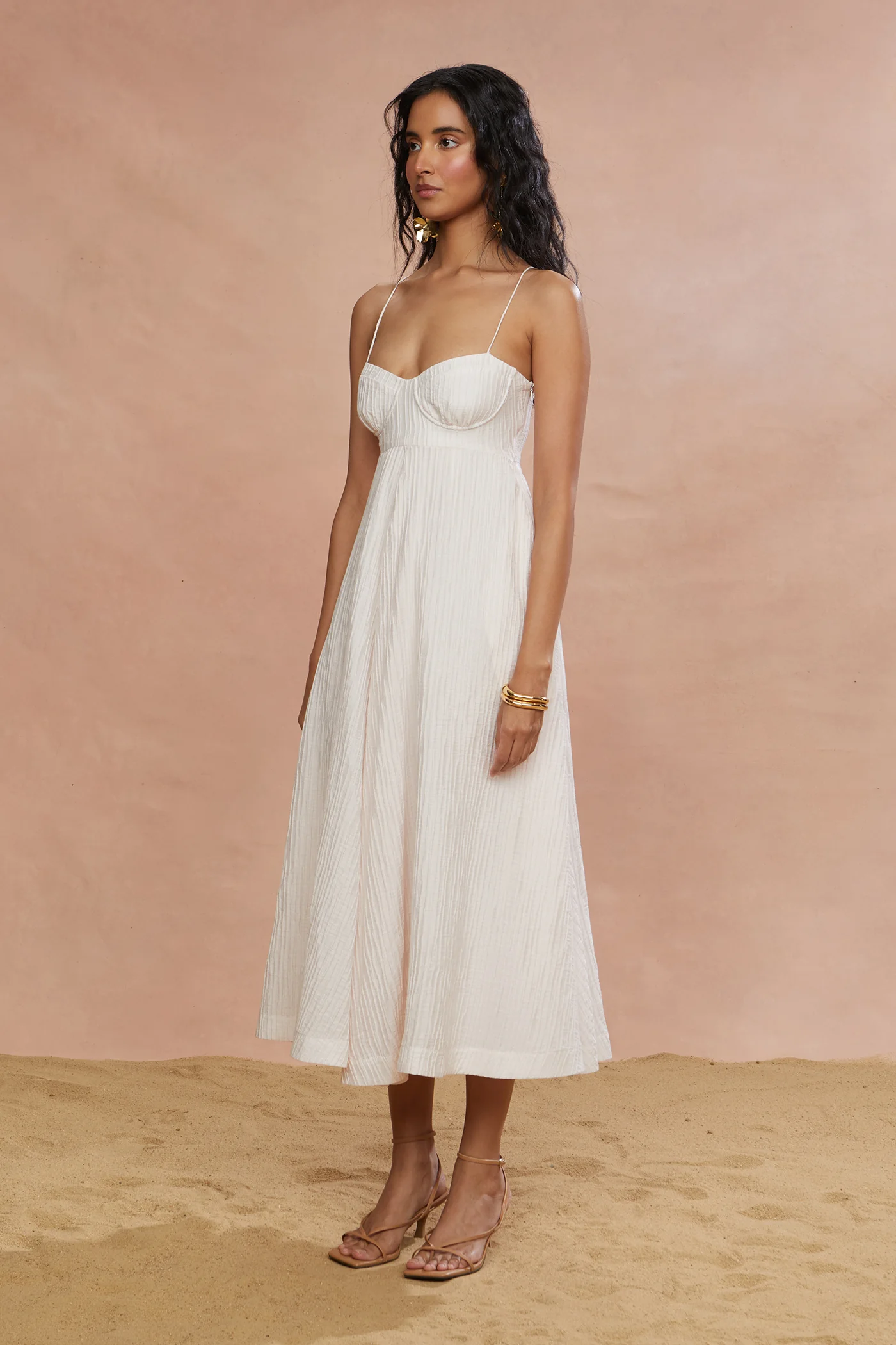 This textured lyocell-blend midi dress features an empire waist and soft bustier detailing, balanced by an easy surplus skirt that floats away from the body. Lightweight and subtly structured, it’s the kind of dress that does all the work while you pretend it’s no big deal.