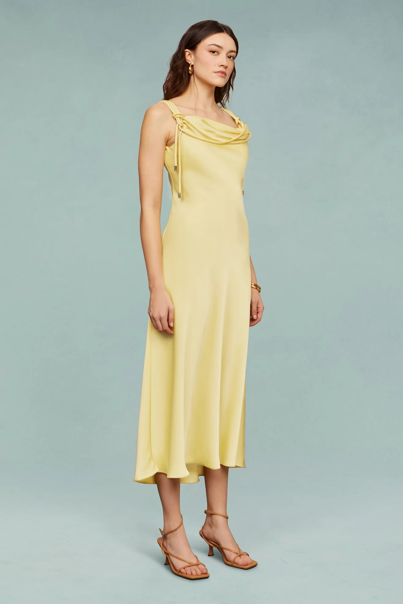 The Liza Dress in a trending butter hue features a bias-cut silhouette that flows with the body, finished with bold corded straps and branded toggle ends.