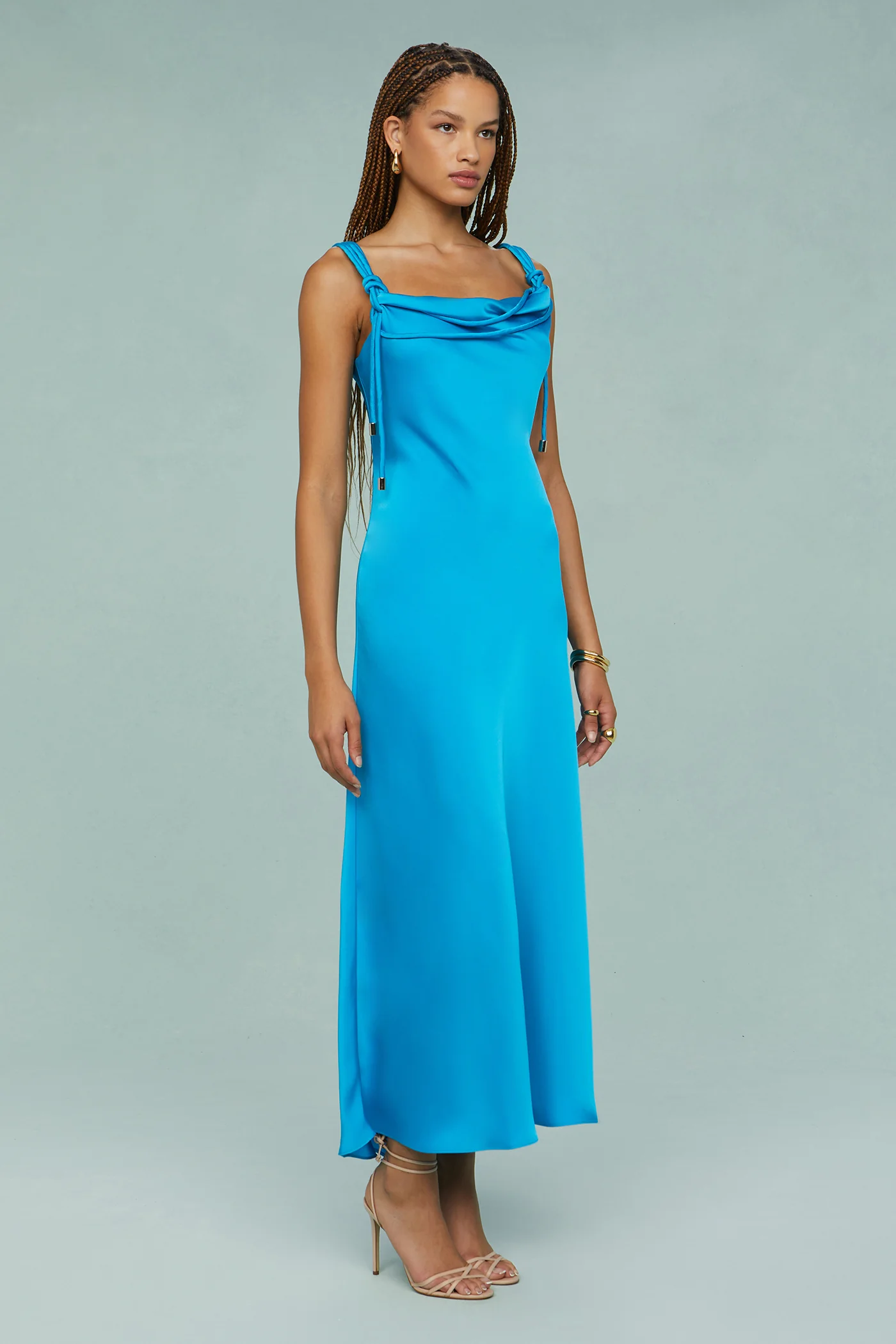 The Liza Dress in a vibrant blue hue features a bias-cut silhouette that flows with the body, finished with bold corded straps and branded toggle ends.