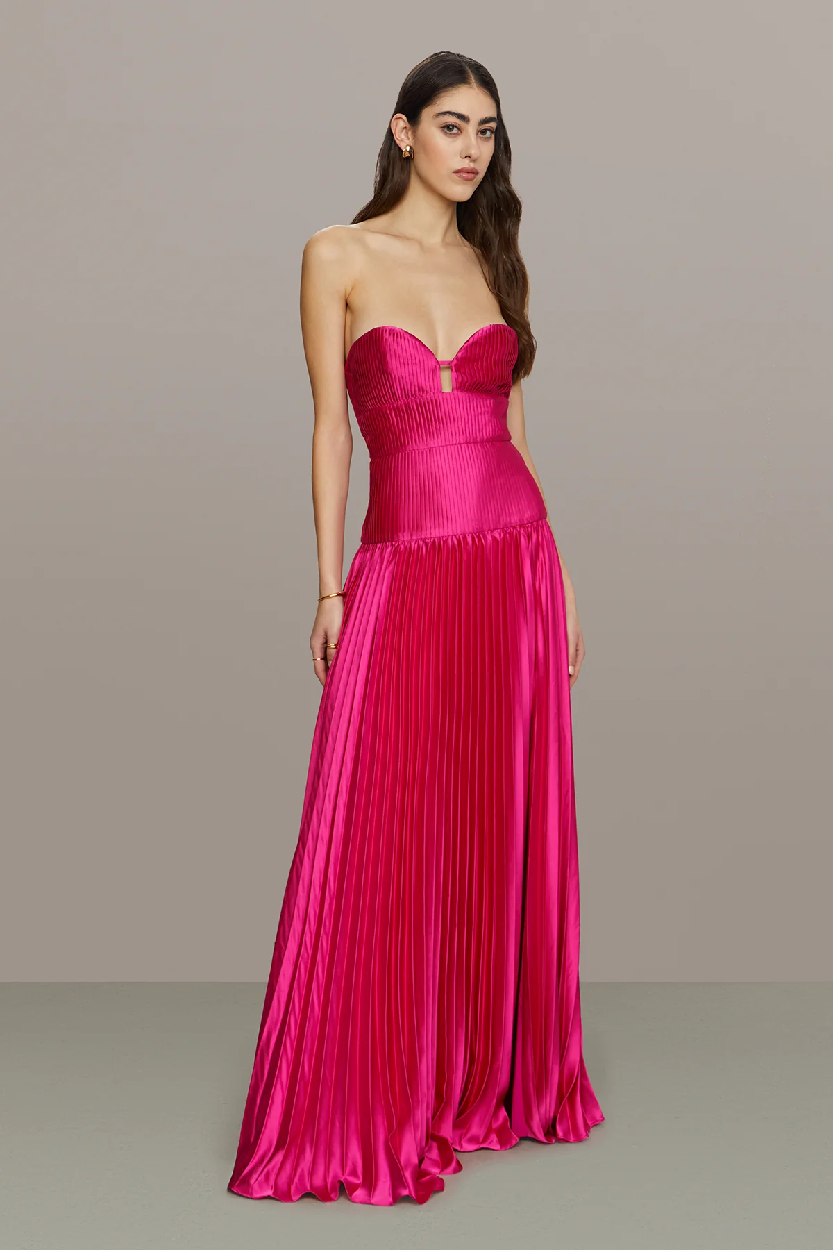 True drop-waist silhouette, featuring knife pleats and a dramatic sunburst pleat with a high slit.